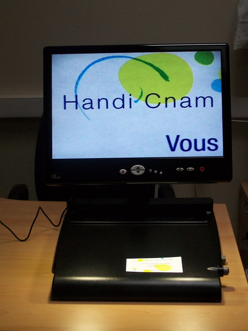 Nous pouvons vous proposer des loupes, des binoculaires, des enregistreurs de cours numériques, des clés USB. La mission Handi'cnam dispose d'un agrandisseur avec écran intégré à utiliser sur place.